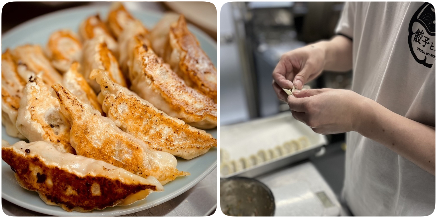 青梅市の製麺所からモチモチの皮を発注。[焼き/揚げ/スープ]の他に、生姜(ニンニク無し)や海老しそ、季節の食材を使った餃子をご用意致します。